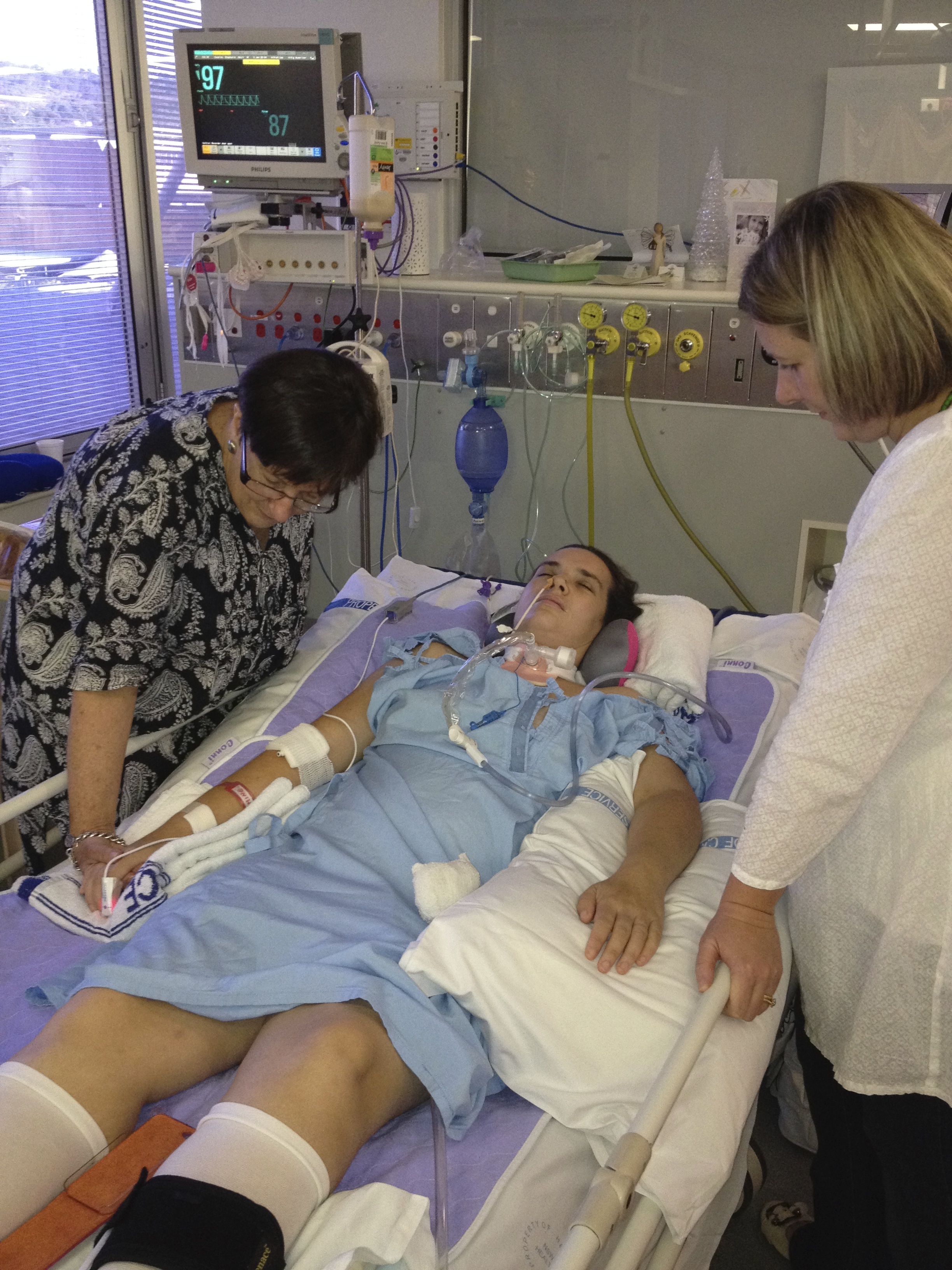 My family soon worked out they needed to watch out for my yawns (remembering that I had no way of drawing attention). Ali was quite disturbed by this whole thing and took her yawn-watch job very seriously. You probably know that our jaw muscles are the strongest in our body so best to stay away. I went to yawn and as my mouth began to shut, she could see that my tongue was sticking out. So what did she do – sticks her finger in. At the same time a nearby doctor was yelling “don’t put your finger in there”. Too late. Ali was now screaming “knock her out” and …. That’s the last I remember. So the good news is I got some good drugs and kept my tongue, and Ali managed to keep her finger.