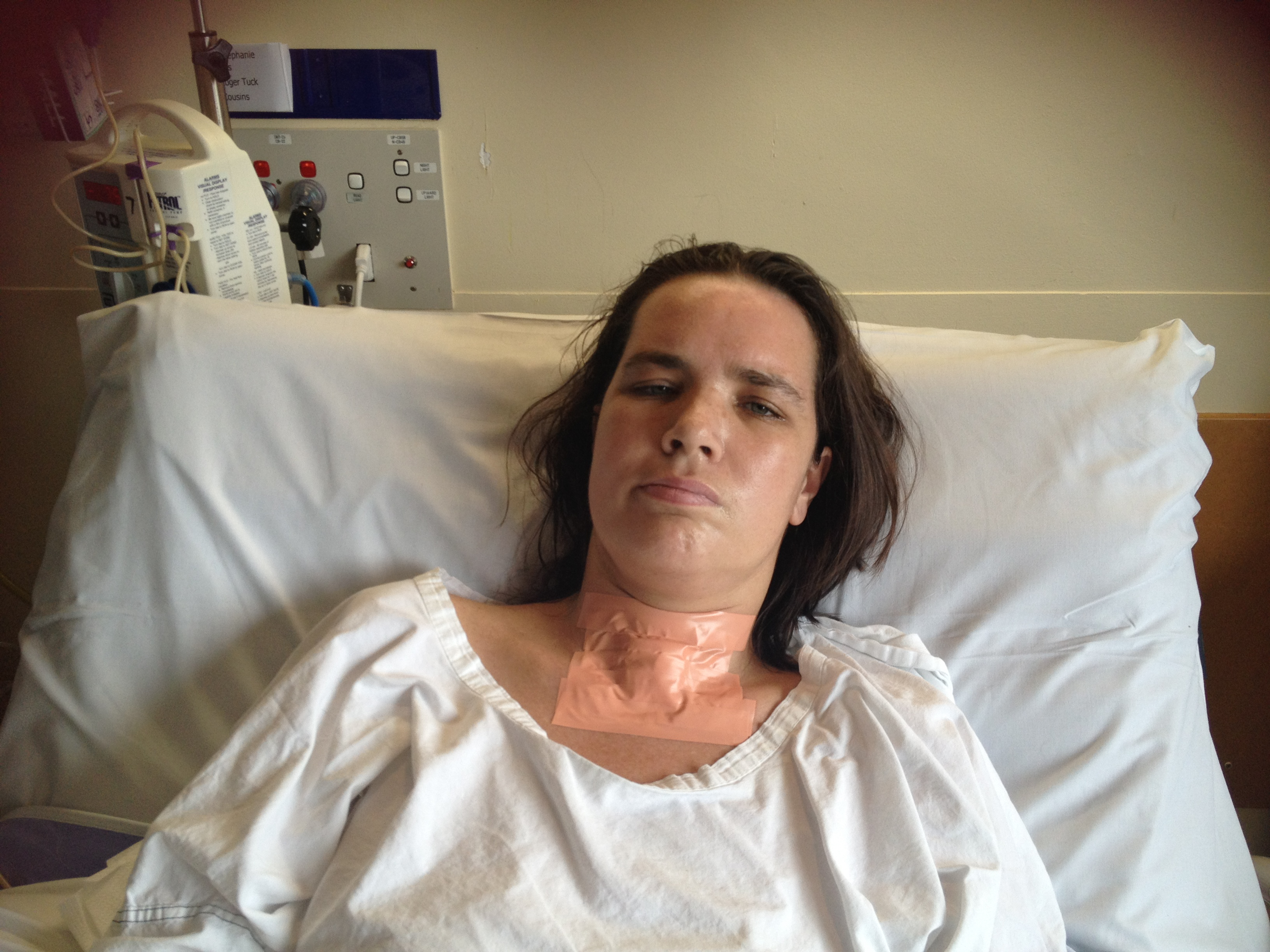 My trache was coming out the following day and I wanted to see it before it did. I asked Courtney (Pete’s wife and my sister-in-law extraordinaire) to show it to me in the mirror. I specified that I didn’t want to see my face. I told Courtney that I was nervous about having my trache out. I was scared I wouldn’t be able to breathe, I was scared I’d need to have it re-inserted. She pampered me to relax me – she gives the best face and head massages.