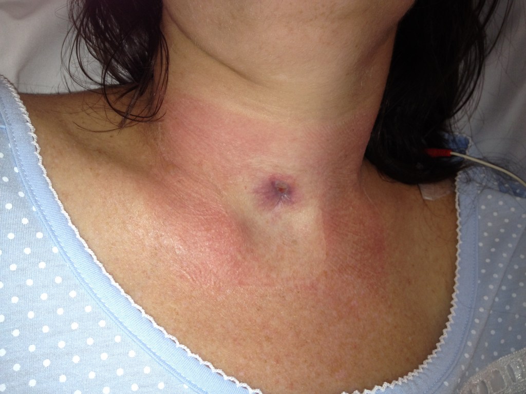 The time had come. I became even more nervous when the ICU crash team turned up! Apparently it’s just procedure. They need to be present – just in case. Removal was very quick and painless. It felt like a non-event. A big heavy tape dressing was placed over the hole to make stop air escaping.